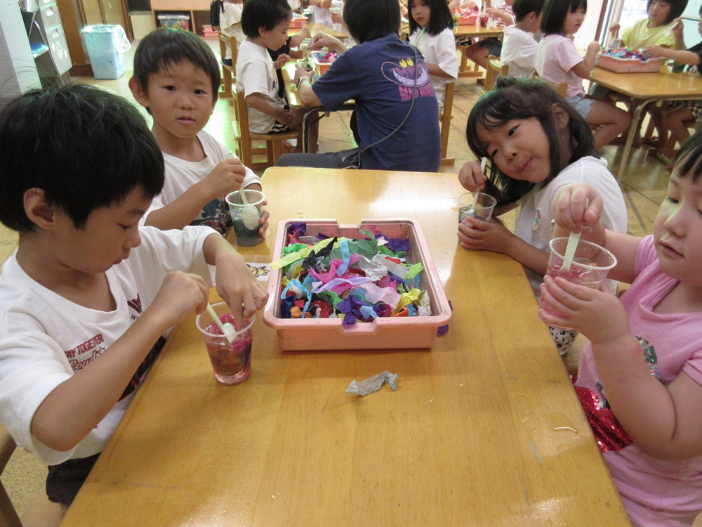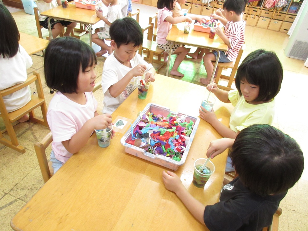 ・保育参観で遊んだフラワーペーパーを使って色水遊びをしました。水を入れた容器に好きな色のペーパーをちぎってスプーンでまぜて「いちご」「メロン」「ブドウ」とおいしそうなジュースができあがりました。