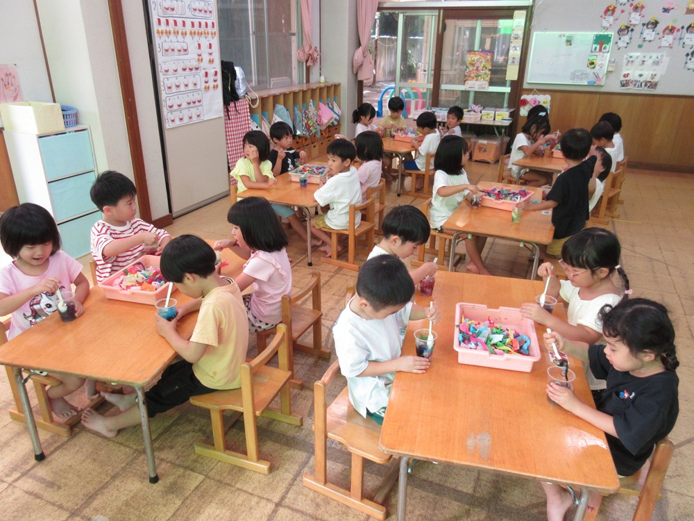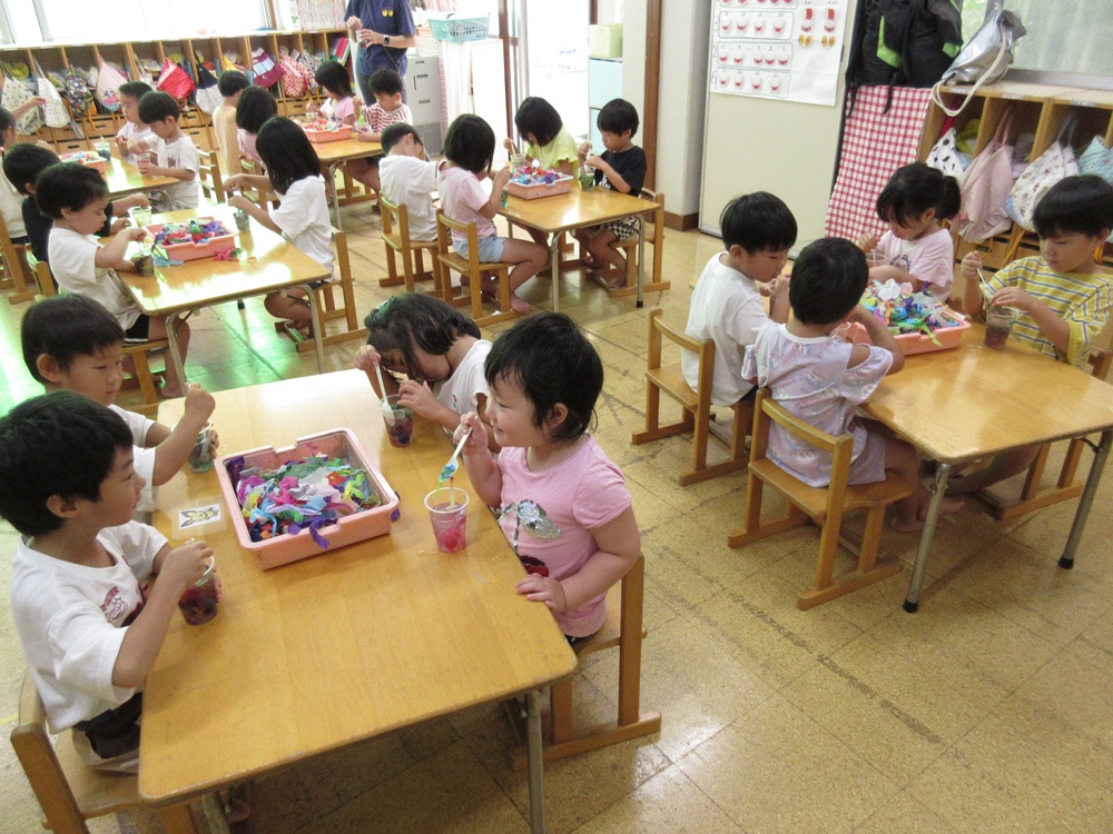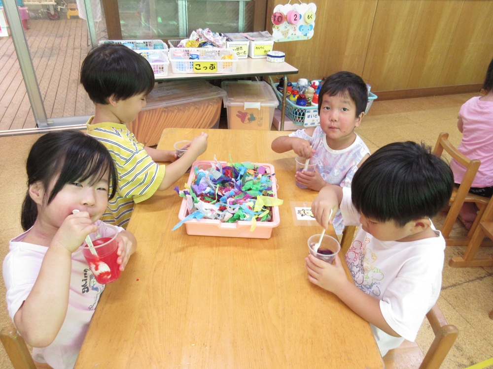 中には「赤と青をまぜたらどんな色のジュースになるかなぁ」と楽しんでいました。夢中になって1時間近く楽しんでいた子どもたちです。