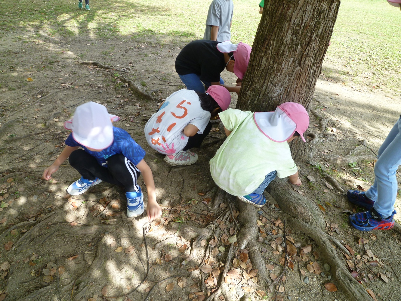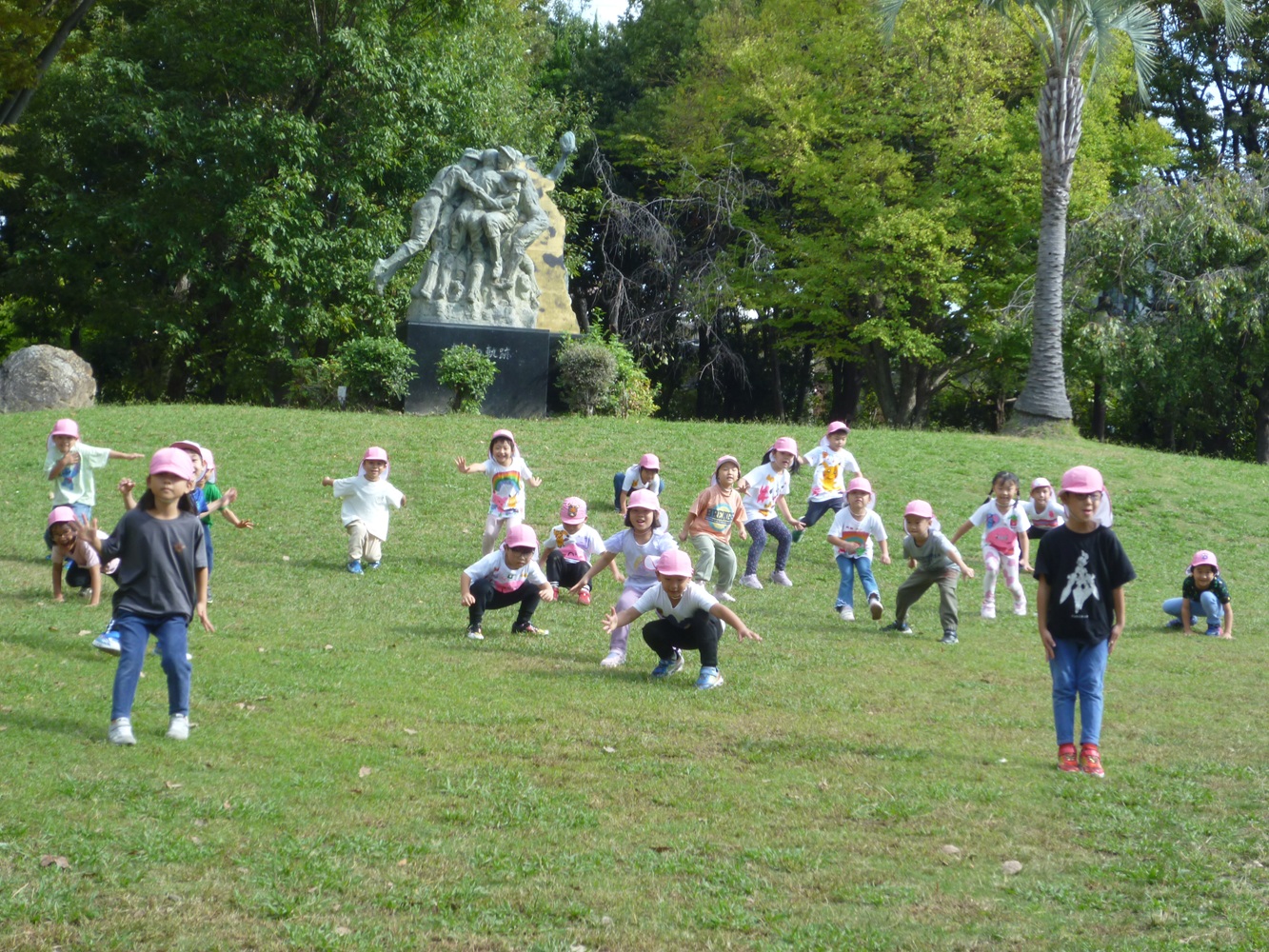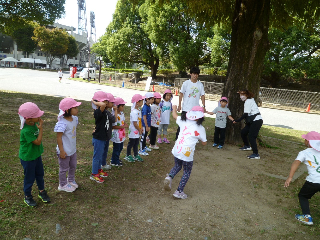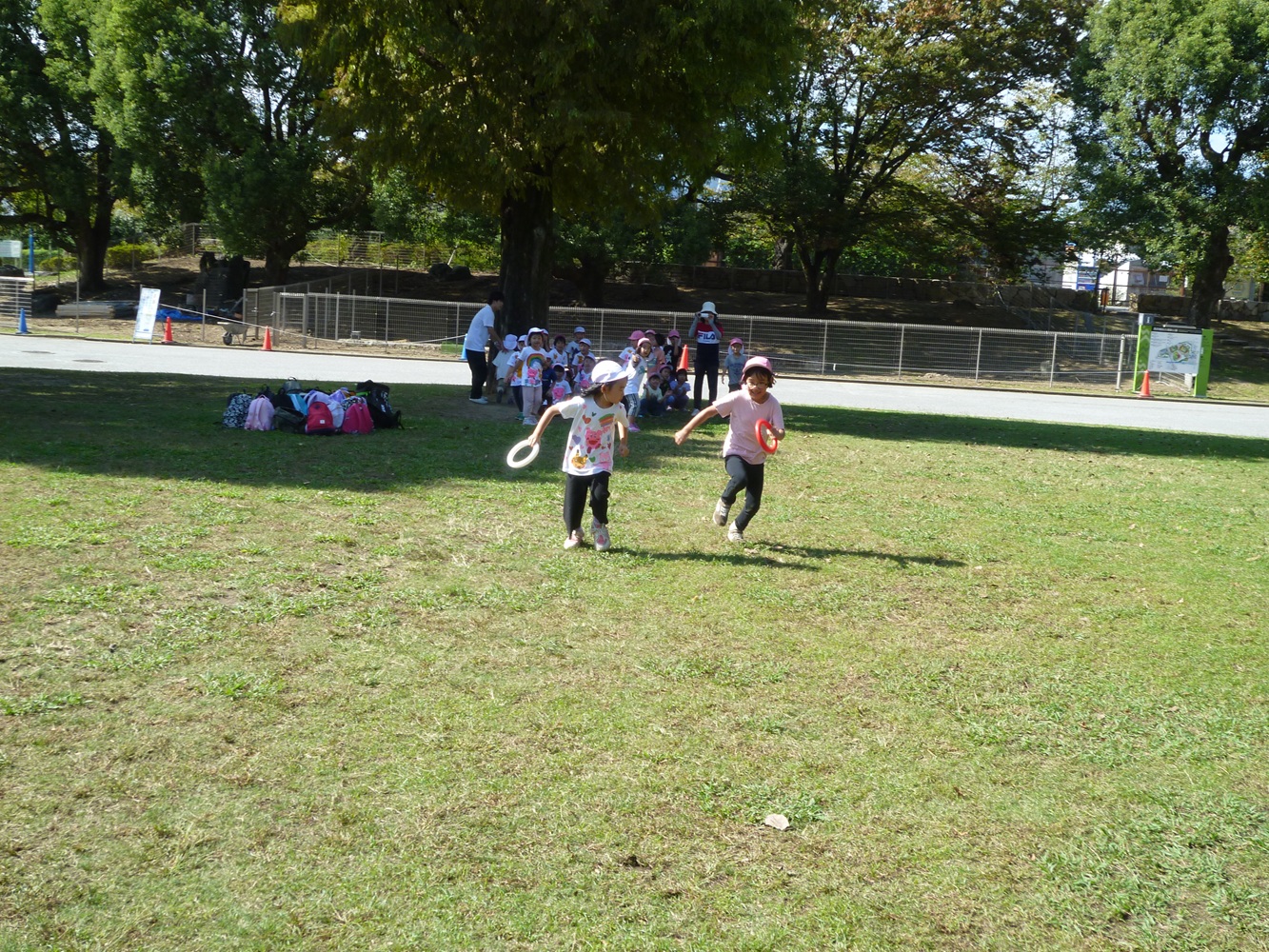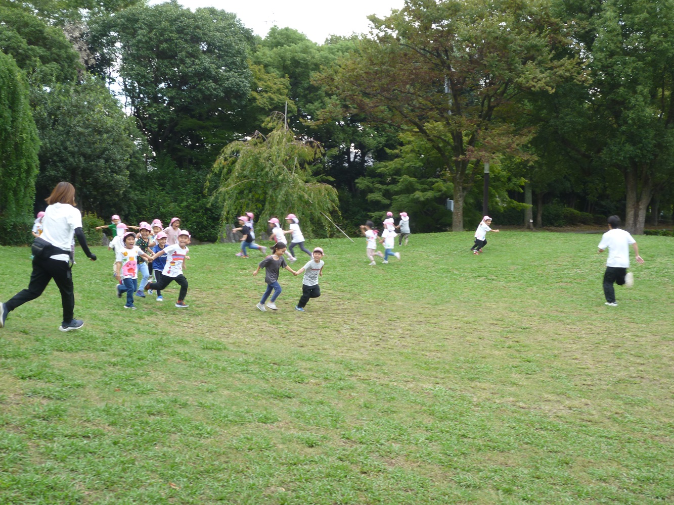 まず最初に「わっかおに」をしました。最初は担任二人が鬼になり、そのあとは子どもたちが鬼を交替。みんな驚くほど走るのが早い!早い!