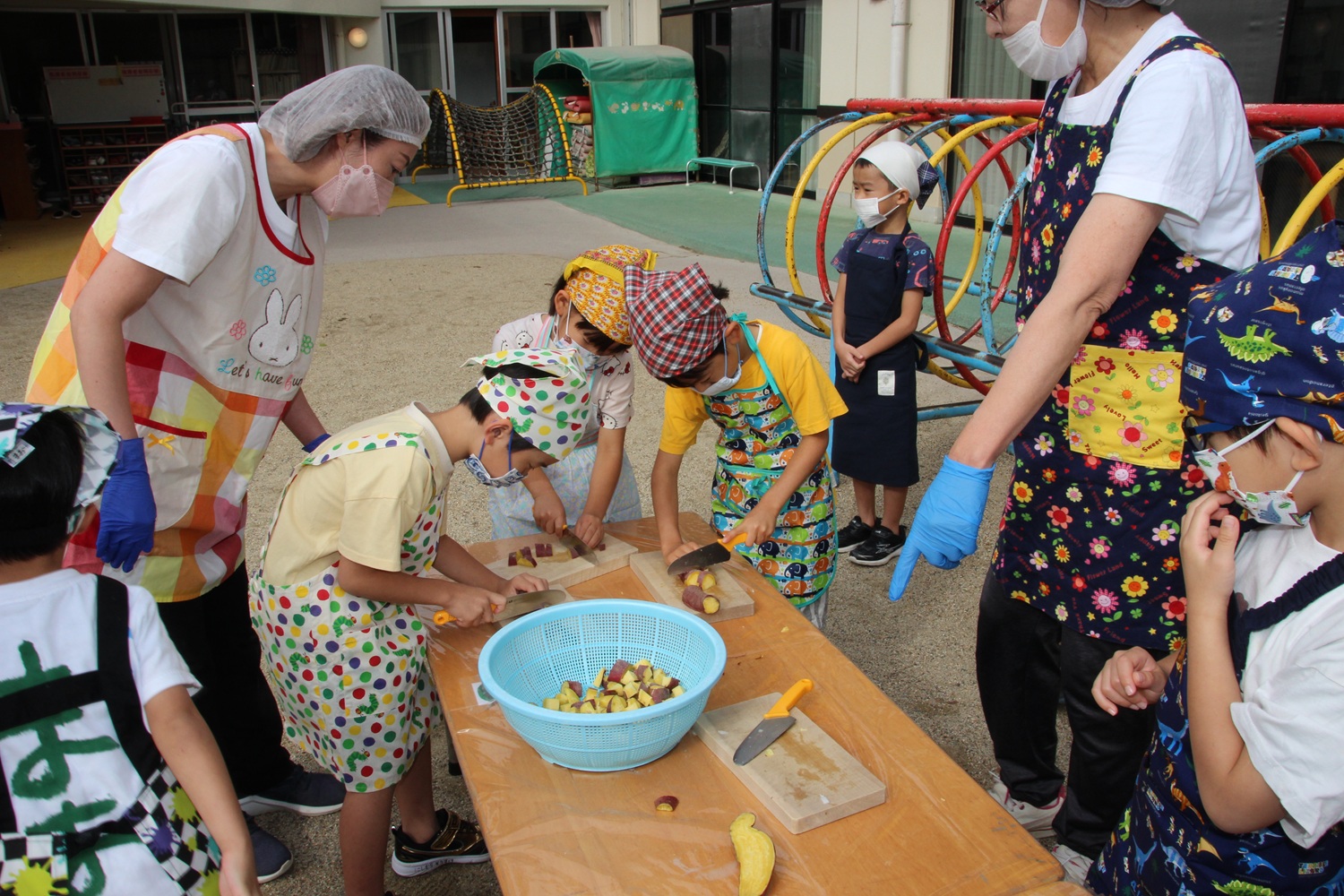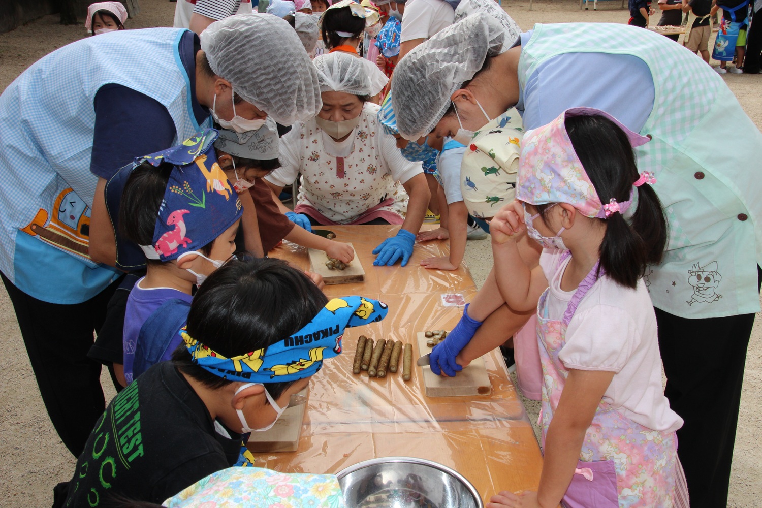 ゆり組は油揚げ・白ねぎ・たまねぎ・さつま芋を切りました。(硬い野菜は給食室で少し柔らかくして切りやすくしてもらいました)