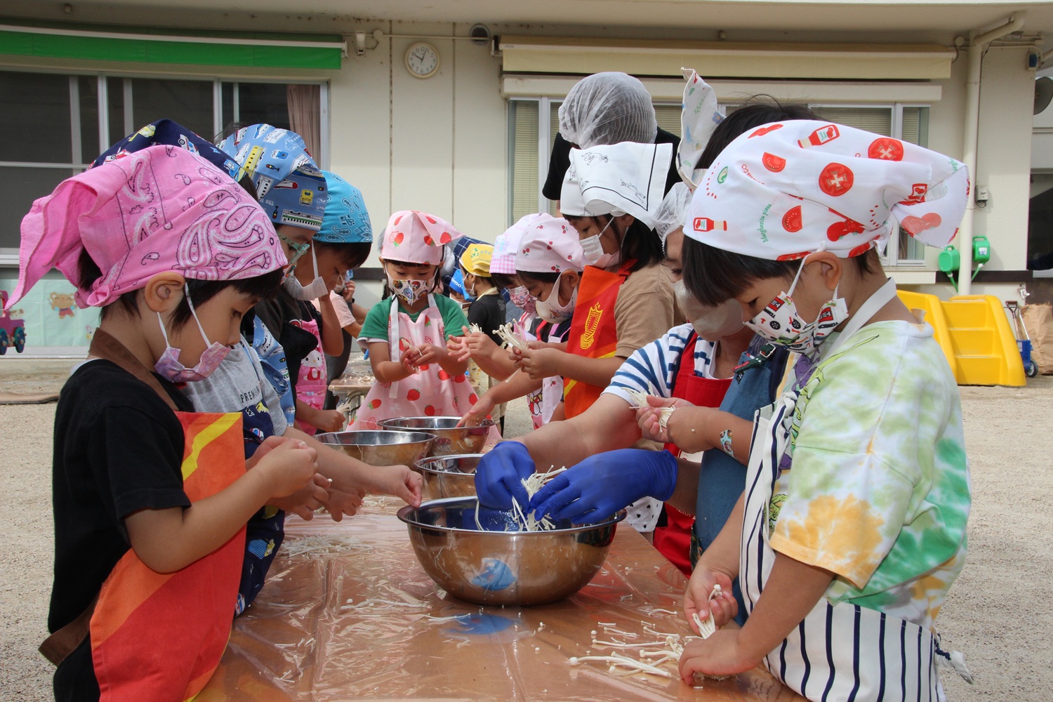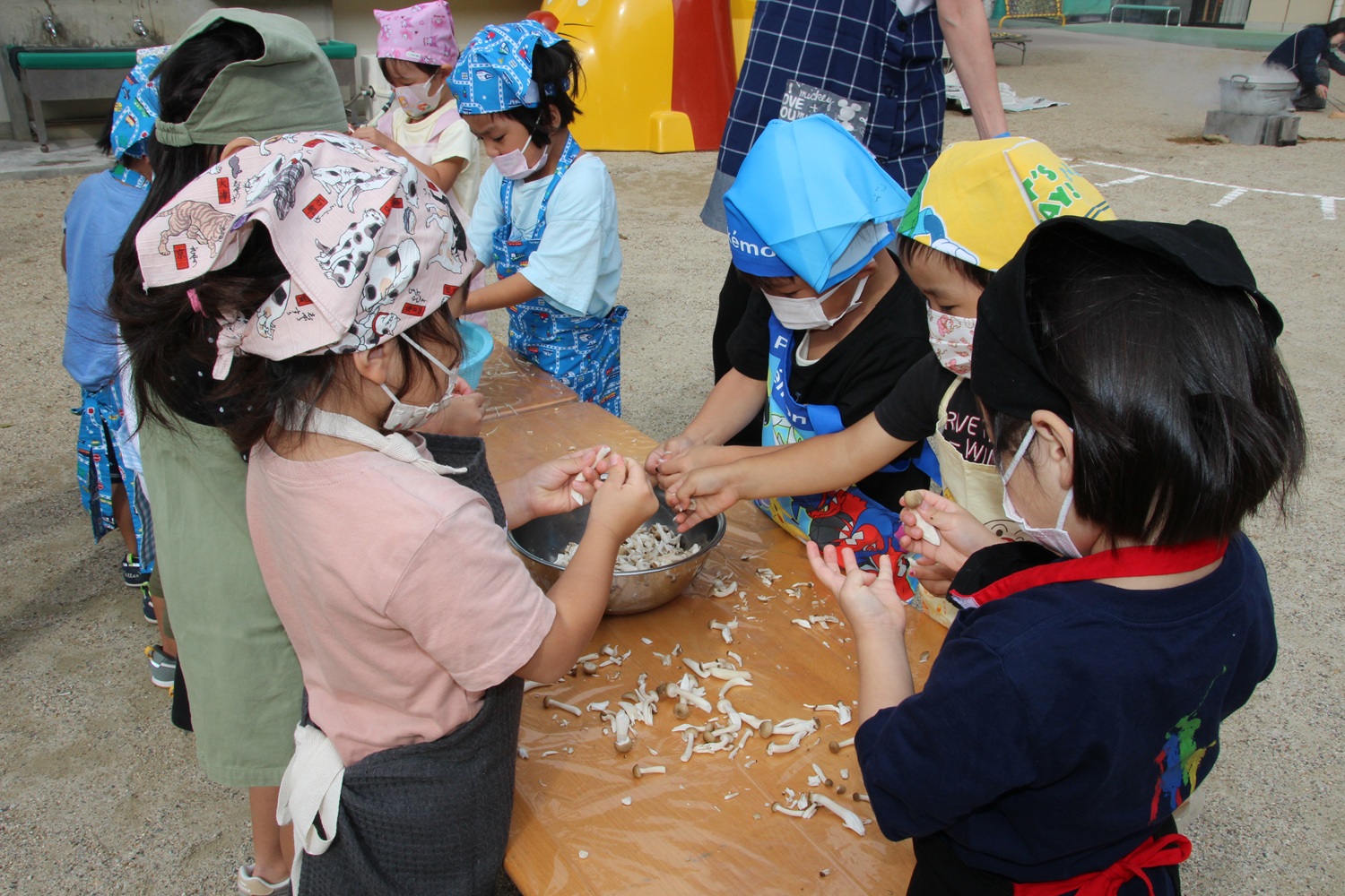 すみれ組は、舞茸・えのきを手でちぎり豆腐をスプーンですくいました。