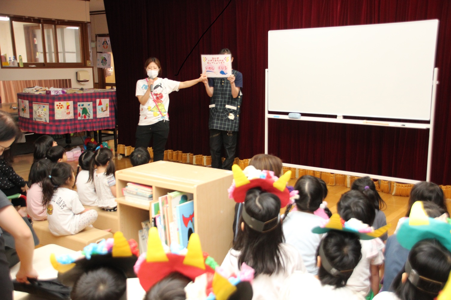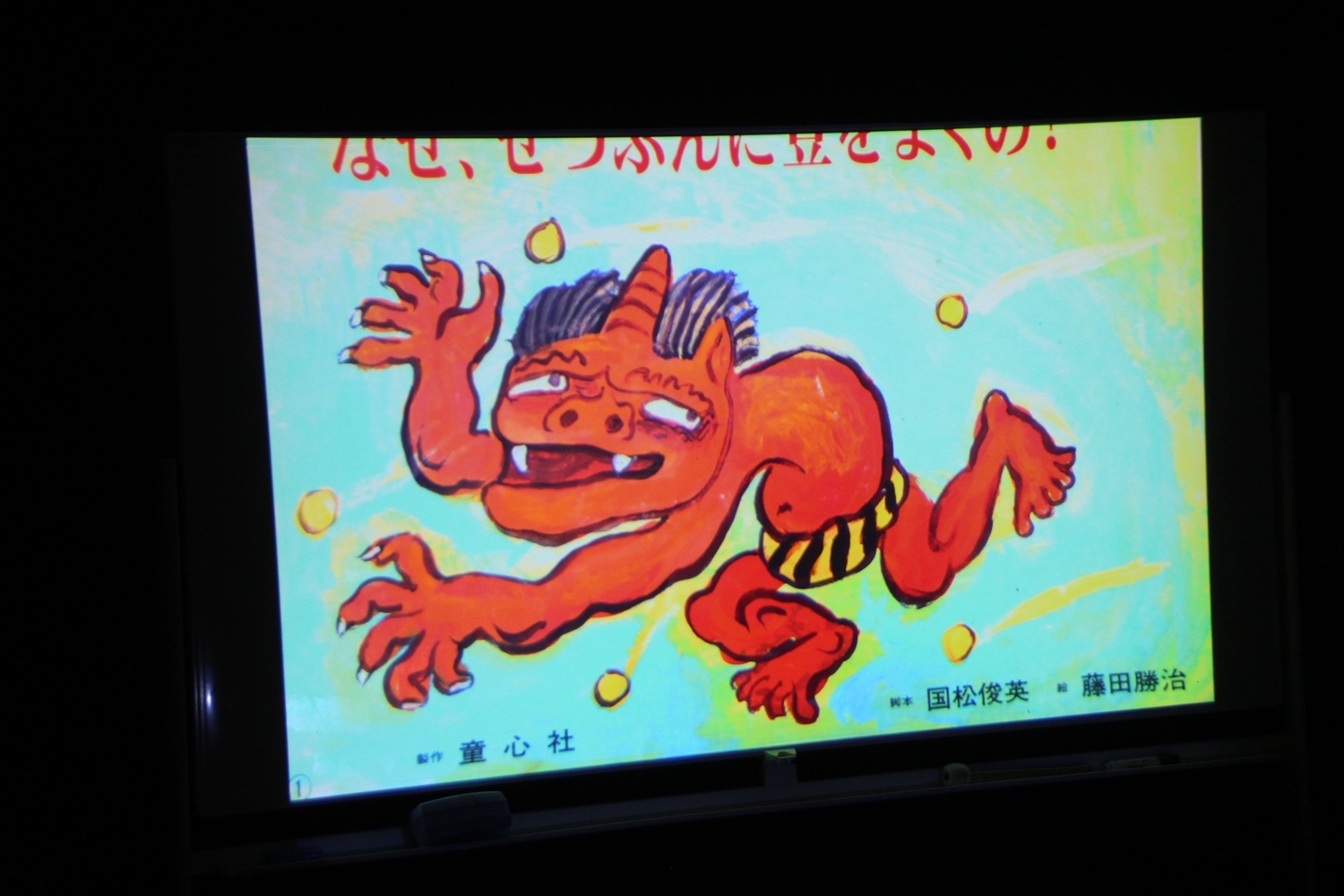 幼児組はホールで「なぜ節分にまめをするの?」のお話をみて、節分クイズをしました。
