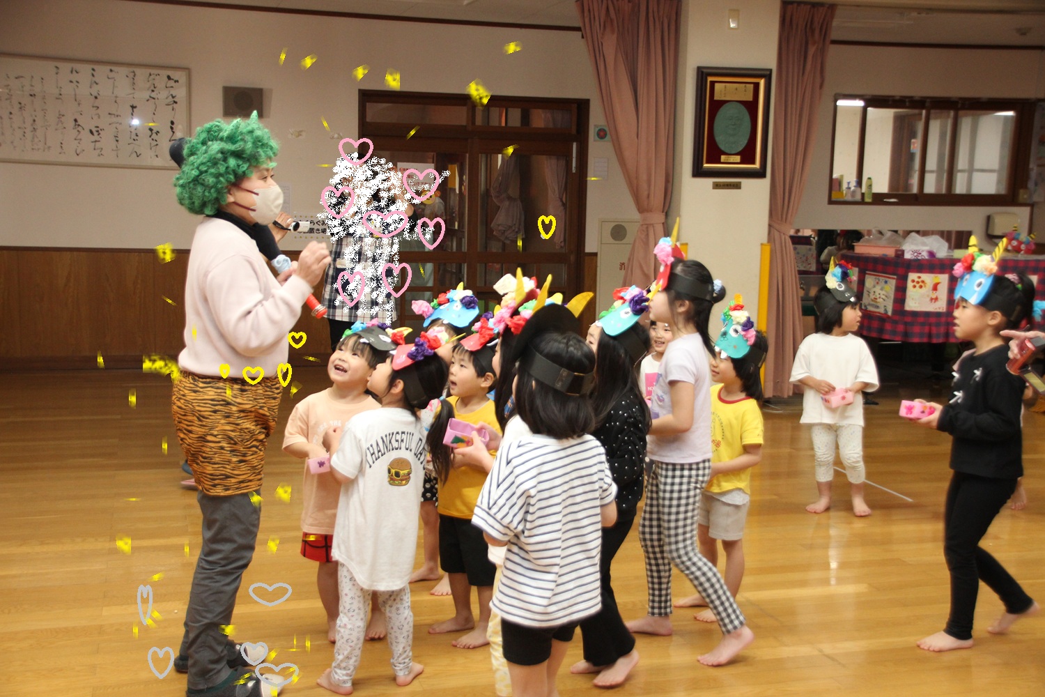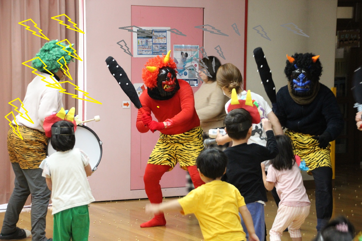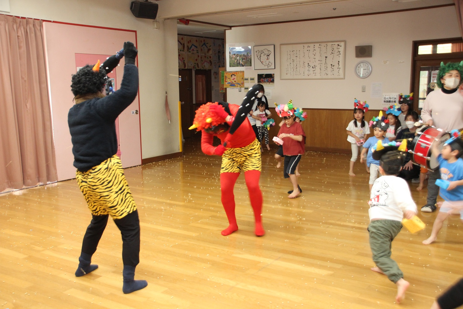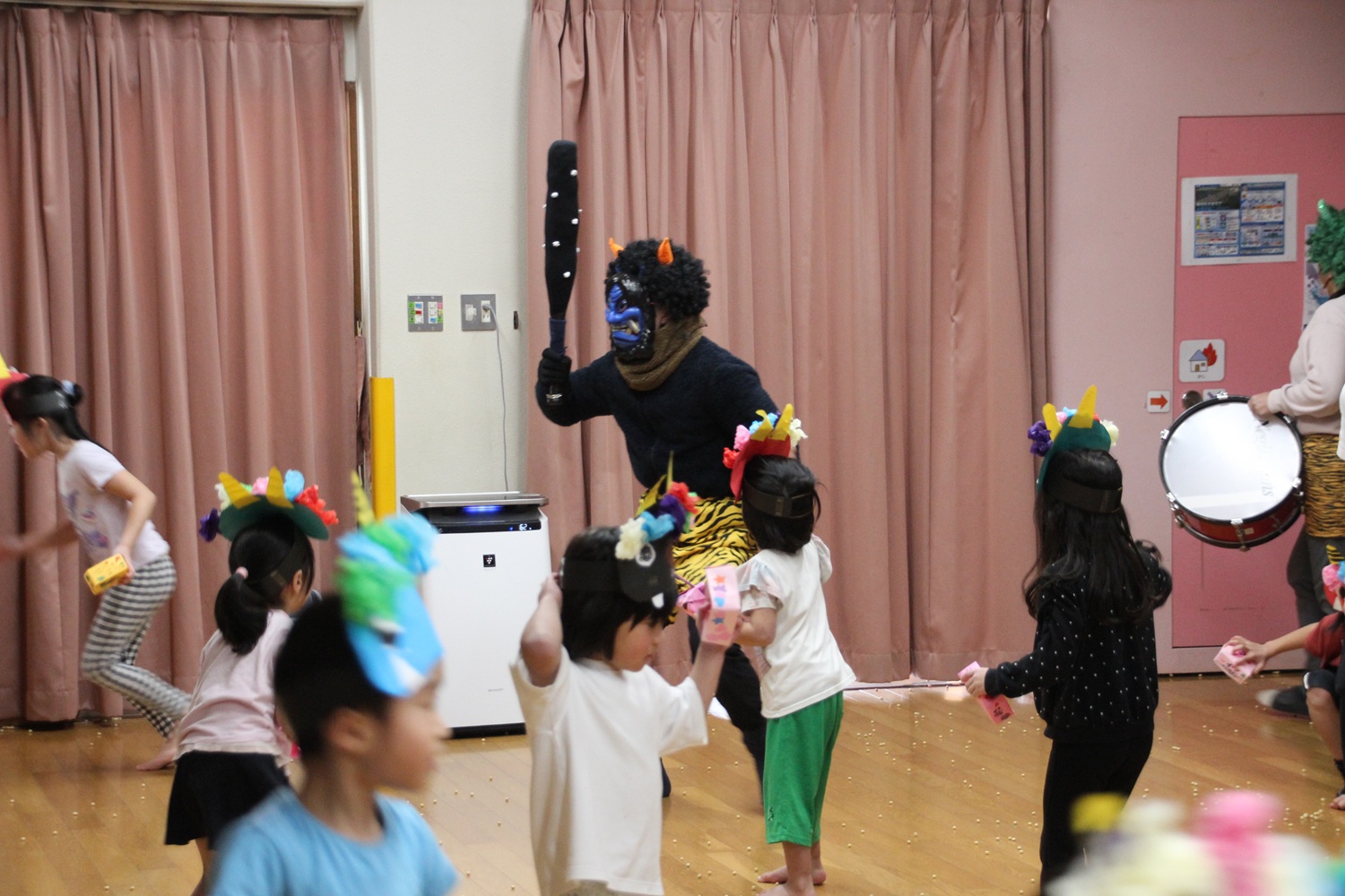 泣きながら鬼に向かって豆を投げる子、勇敢に鬼に向かっていく子、部屋の隅に隠れてしまう子、担任にしがみついて離れない子がいましたよ。