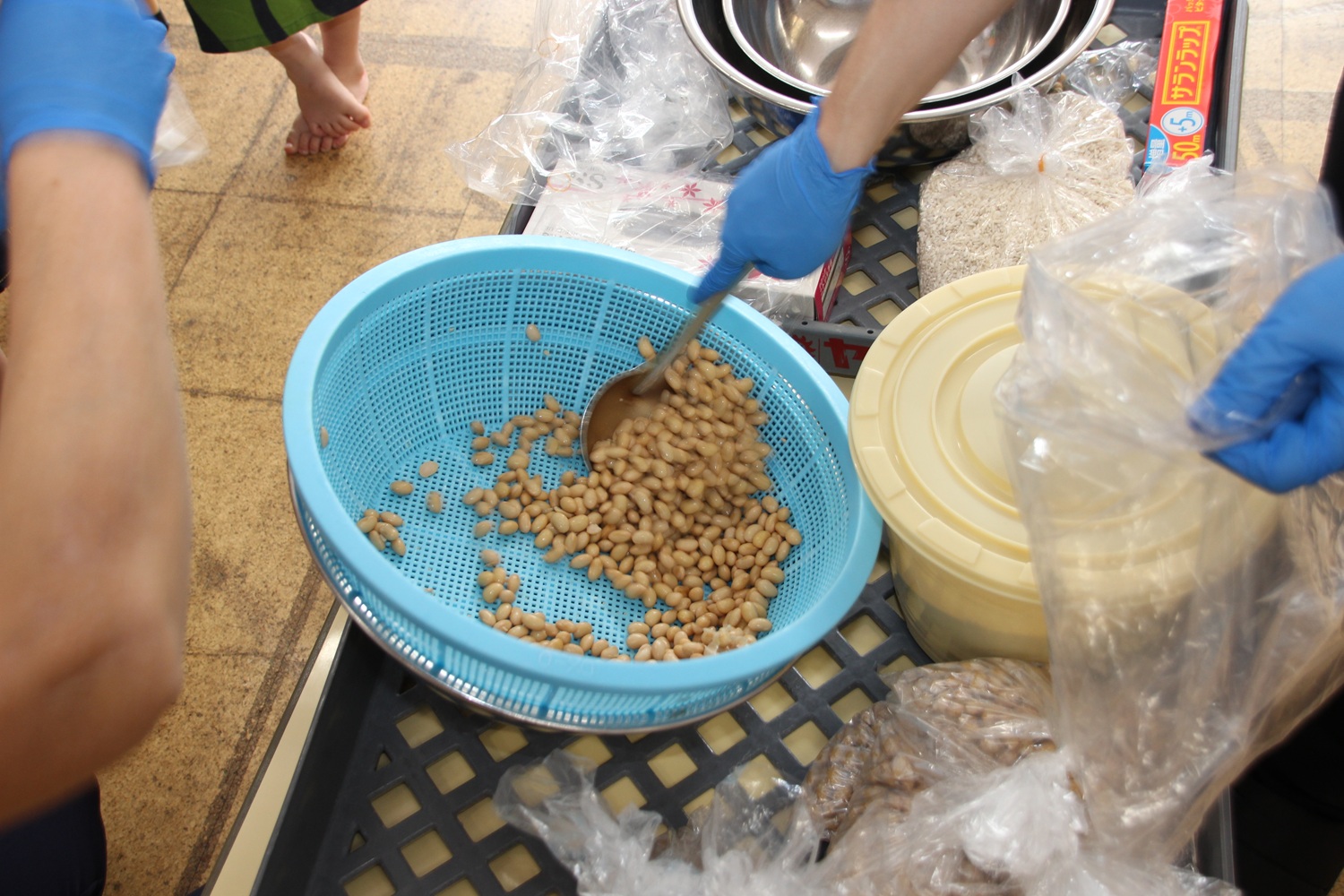 昨日、子どもたちが大豆を洗い、朝から給食室で大豆をゆでてもらいました。