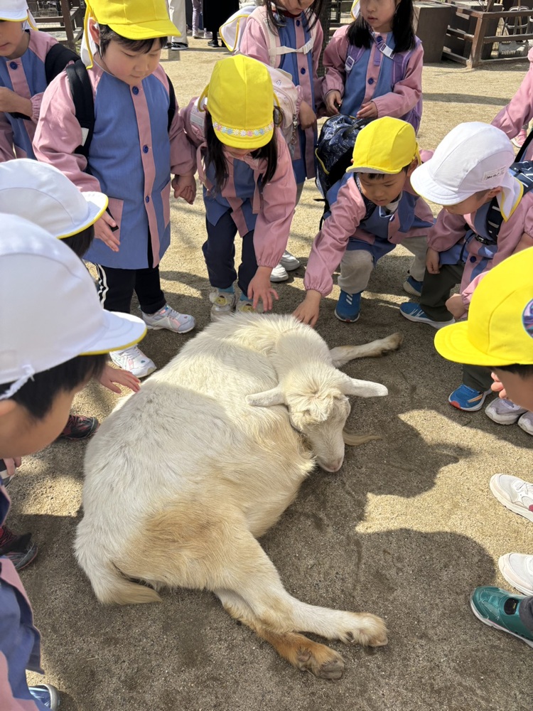 なたぼっこをしているやぎのひかりちゃんを優しくなでなでしています。