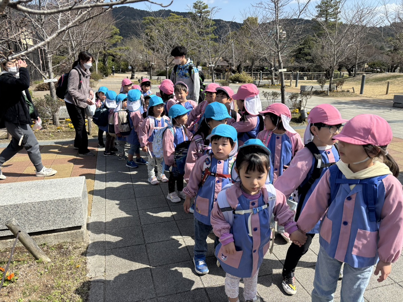 バスの乗降所までゆり組とすみれ組の子どもたちが手をつないで歩いていきましたよ。