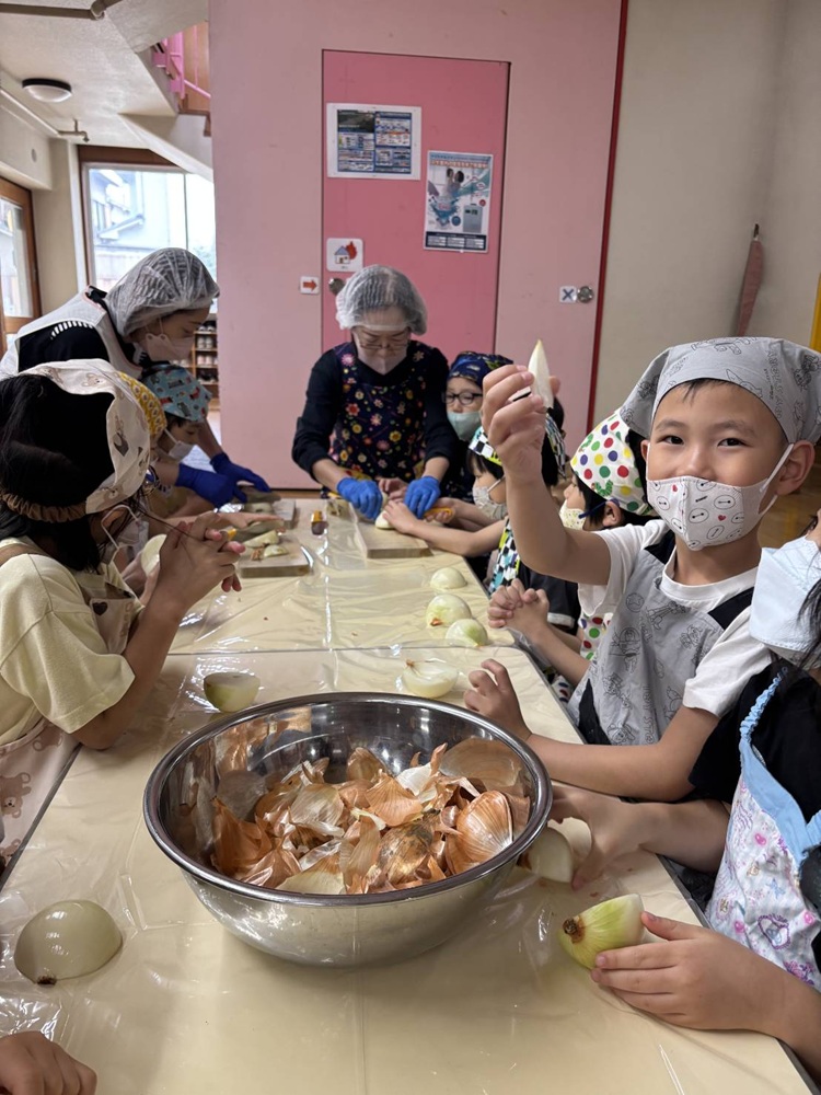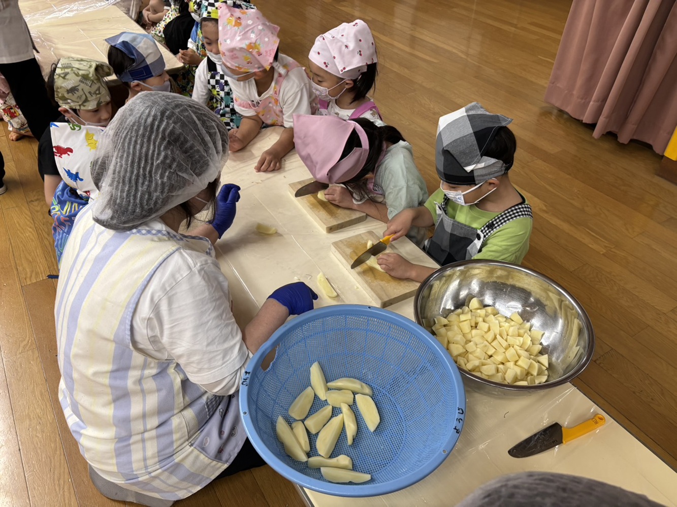 きく組はキュウリを包丁で切り、にんじんの型抜きの担当、ゆり組がじゃが芋と玉ねぎを包丁で切りました。