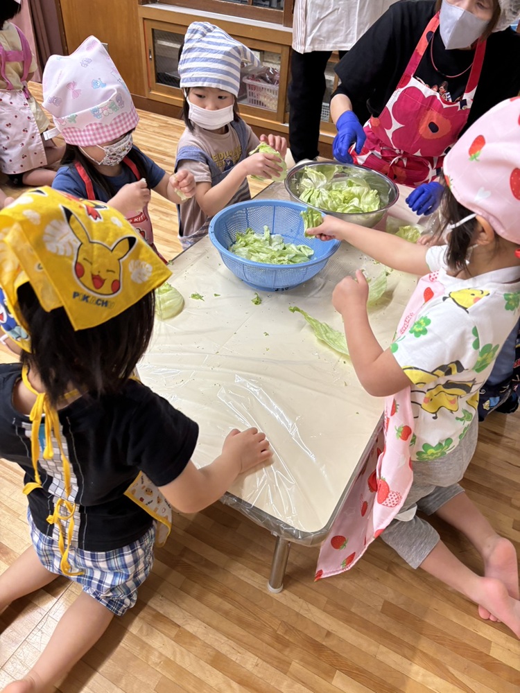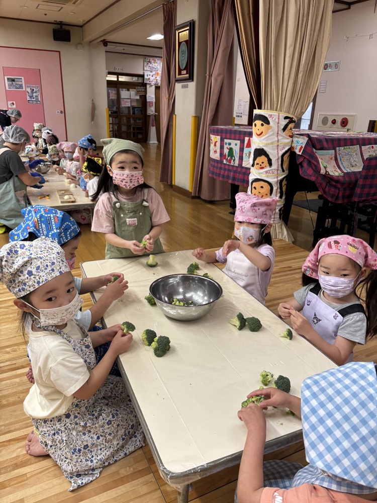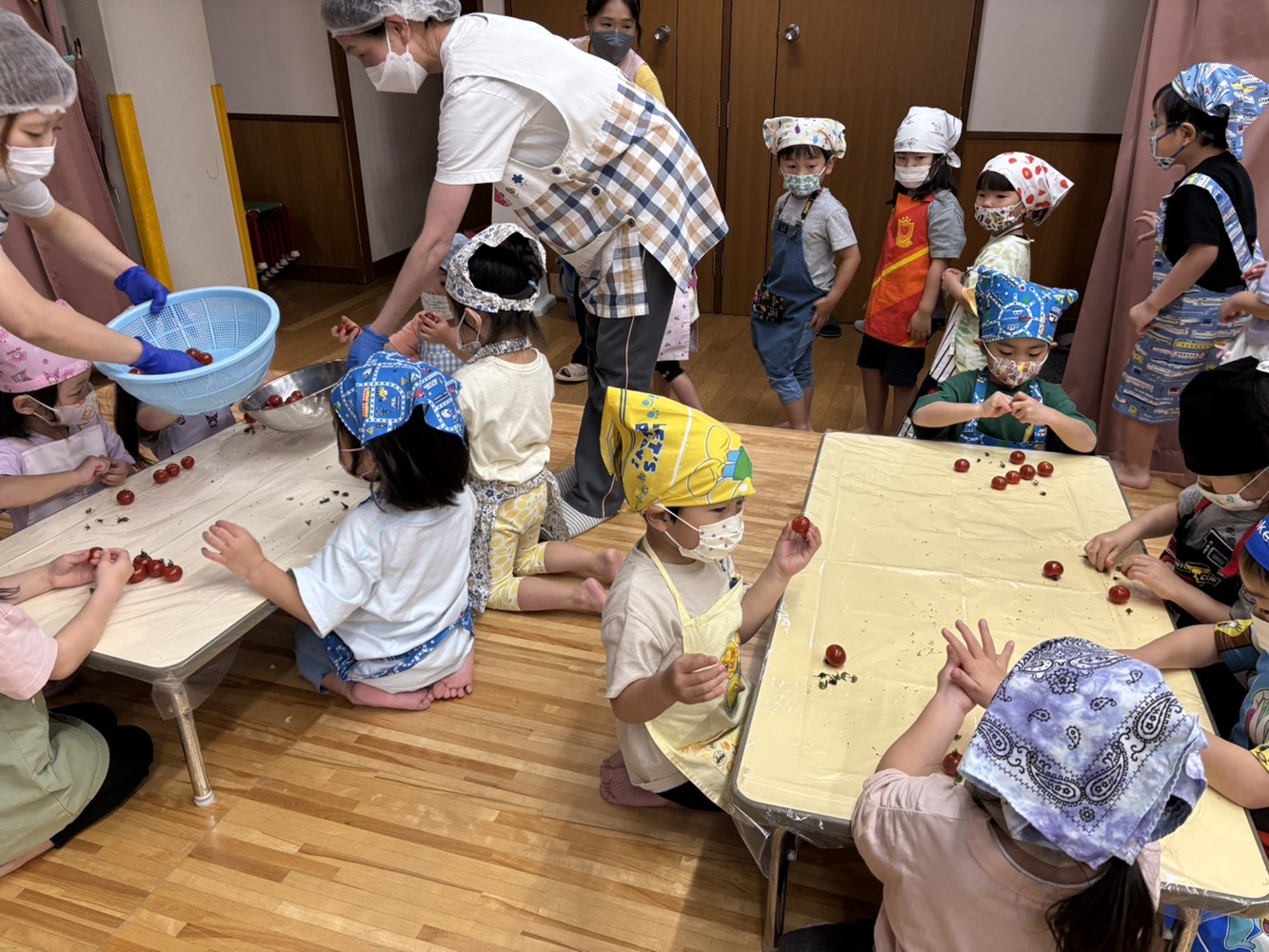 クッキングは、すみれ組がレタスとブロッコリーちぎり、プチトマトのへた取りの担当、