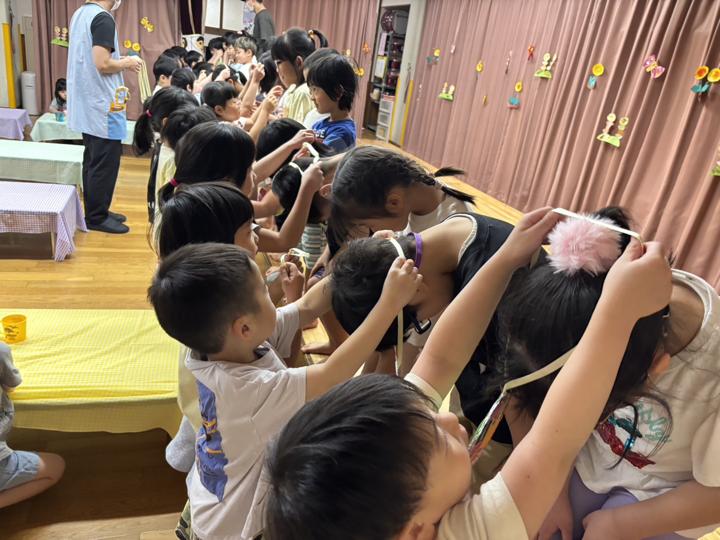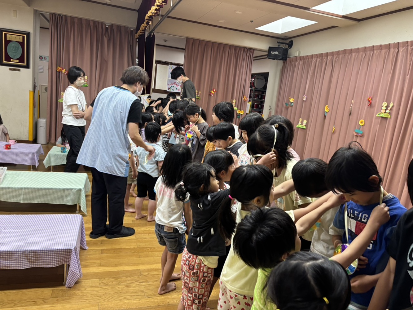 お別れ会では、すみれ組はホールの飾りを作り、きく組からゆり組へのプレゼントはメダルで、ひとりひとりの首にかけてあげました。