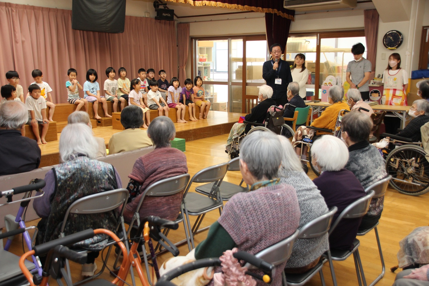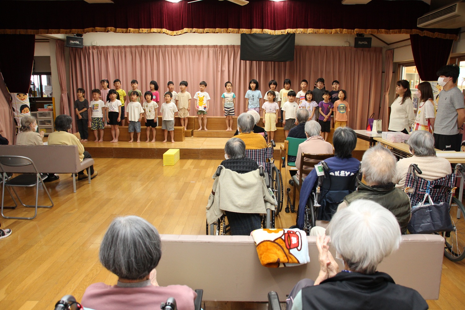 それから歌のプレゼントもしました。こどもたちの歌声に涙を流されるおじいちゃん、おばあちゃんもいらっしゃいました。