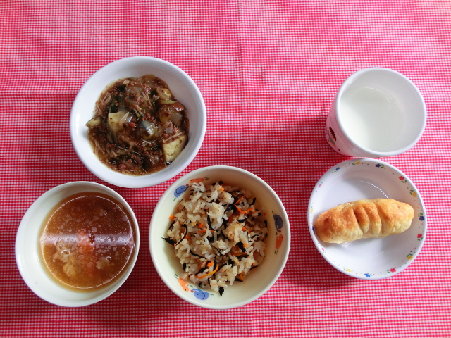 ひじきご飯 揚げ茄子のそぼろあんかけ 冬瓜と豚肉の味噌汁