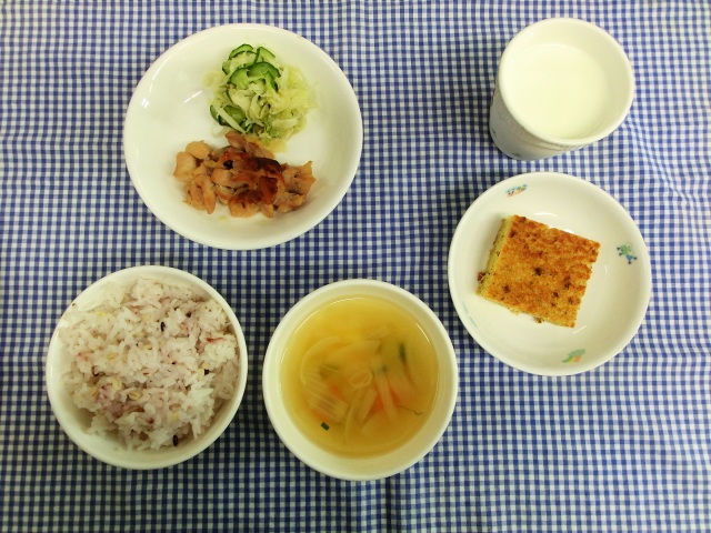 雑穀ごはん ローストチキン キャベツサラダ 野菜スープ