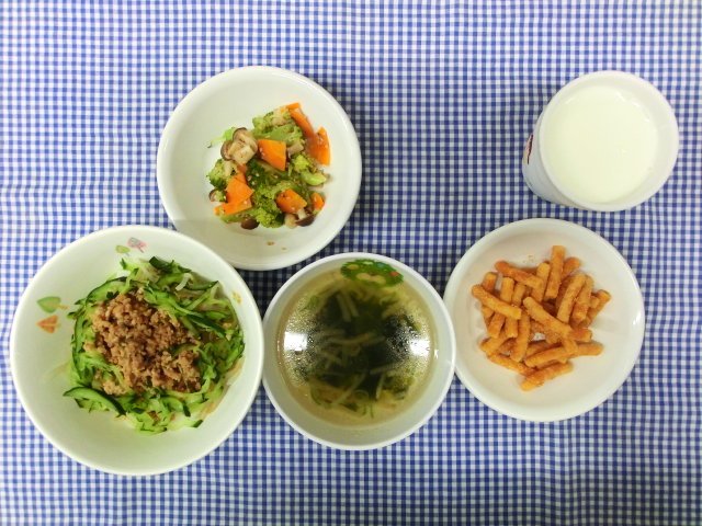 肉みそ丼 ブロッコリーサラダ 若布スープ
