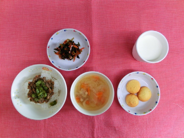 さばのそぼろご飯 あらめの洋風サラダ 野菜スープ