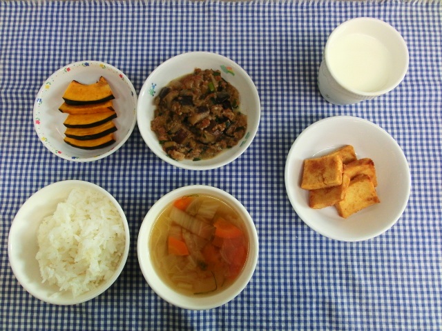 ごはん マーボー茄子 焼き南瓜 中華スープ