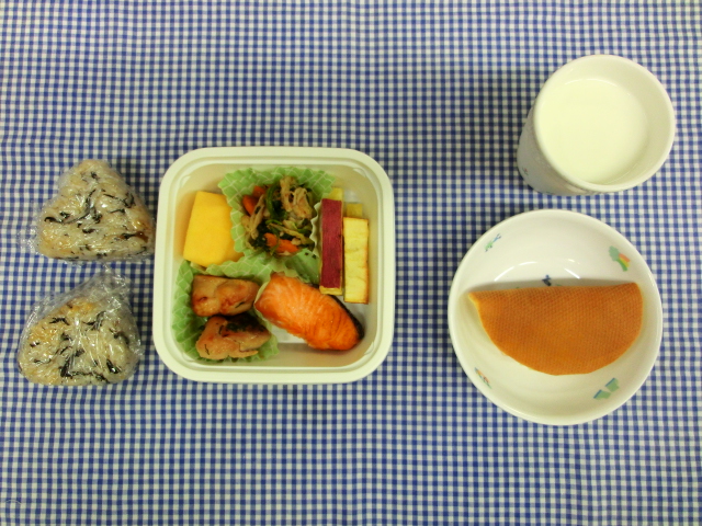 (幼児)なめこの炊き込みおにぎり 鮭の塩焼き 鶏肉の味噌焼き 野菜のおかか和え さつま芋スティック 柿
