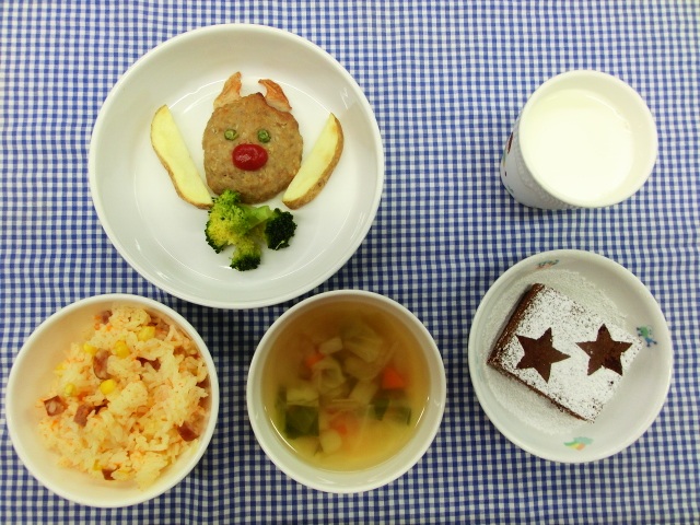 キャロットライス トナカイバーグ フライドポテト 野菜スープ