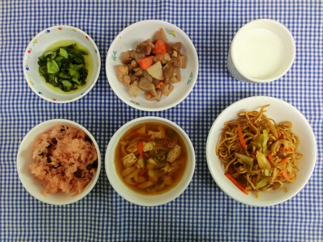 小豆ごはん 筑前煮 若布の酢の物 もやしの味噌汁
