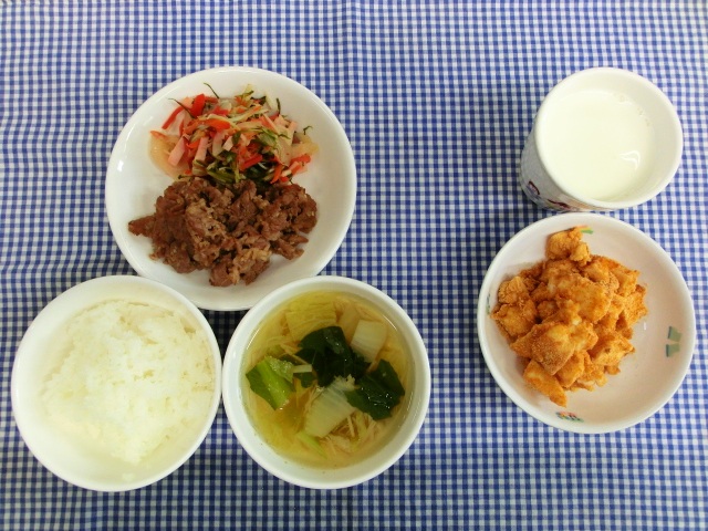 ごはん 牛肉のごま炒め 京人参と水菜のサラダ えのきの清汁