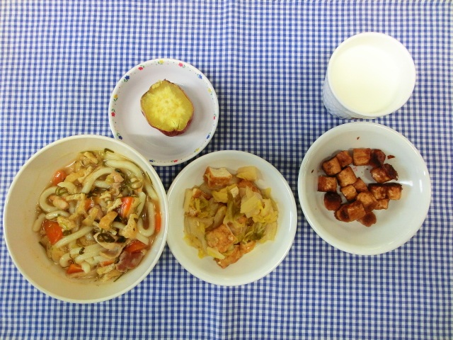あんかけうどん 白菜と厚揚げの炒め煮 蒸し芋