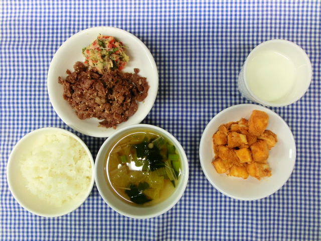 ごはん 牛肉のごま炒め 卯の花サラダ えのきの清汁