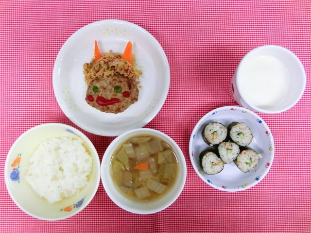 ※2歳児から5歳児クラスは、おやつの細巻きを自分で巻いて、まるかぶりしました。