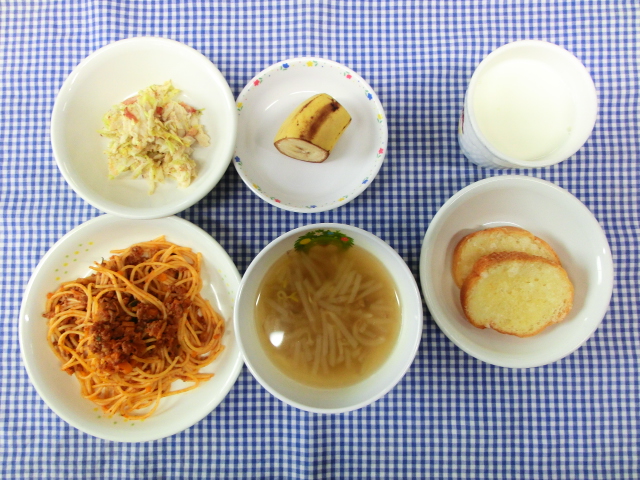 ボロネーゼ 白菜サラダ もやしのコンソメスープ バナナ(追加)